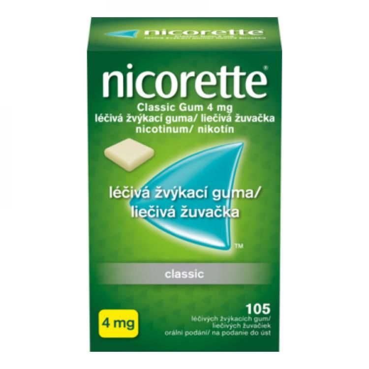 Nicorette® Classic Gum 4 mg liečivá žuvačka so sviežou príchuťou tropického ovocia je určená na odvykanie pre fajčiarov s vyššou mierou závislosti, ktorí fajčia viac ako 20 cigariet denne. Liečivé žuvačky sú vhodnou voľbou pre tých, ktorí svoju chuť na cigaretu potrebujú zahnať činnosťou, pretože terapeutický nikotín sa uvoľňuje po dobu 30 minút za pomalého žuvania. Liečivá žuvačka Nicorette® Classic Gum je vyrobená špeciálnou receptúrou, ktorá uvoľňuje malú dávku terapeutického nikotínu. Tá sa postupne vstrebáva do krvného obehu cez sliznice v ústnej dutine, čo umožňuje aktívne bojovať proti siedmim abstinenčným príznakom odvykania: chuť na cigaretu, úzkosť, podráždenosť, zlá nálada, nepokoj, nesústredenosť a zvýšená chuť do jedla.