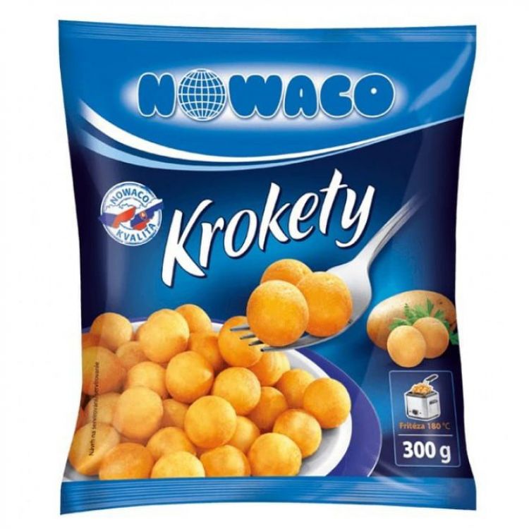 Nowaco krokety Hlbokozmrazený zemiakový výrobok. Hmotnosť: 300 g Hmotnosť kartóna: 6 kg (20 x 300 g) Šarža:; Minimálna trvanlivosť do: viď obal výrobku Skladujte pri teplote -18 °C alebo nižšej. Uchovanie u spotrebiteľa: * 6 °C 1 týždeň ** -12 °C 1 mesiac *** -18 °C viď dátum Minimálna trvanlivosť do Po rozmrazení znova nezmrazujte. Pred prípravou nerozmrazujte. Krajina pôvodu: Česká republika Návod na prípravu: Zmrazené krokety smažíme po menších dávkach v rozpálenom tuku pri teplote 170 °C dozlatista.