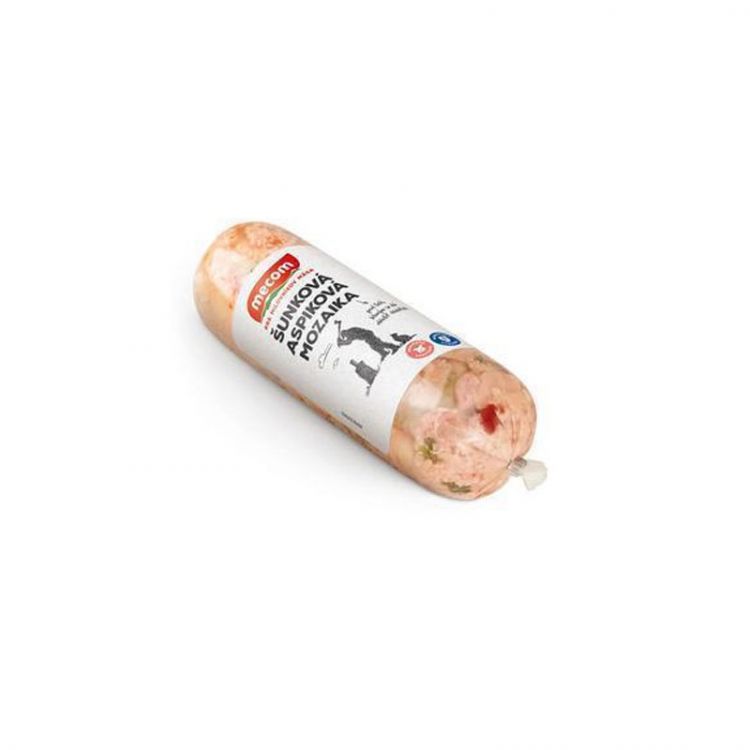 Dusená šunka štandard 64 % (bravčové stehno bez kosti 52%, pitná voda, škrob, jedlá soľ, stabilizátor E451, bravčová bielkovina, dextróza, zahusťovadlá E407, E417, regulátor kyslosti E331, antioxidanty E316, E301, aróma, extrakty korenín, konzervačná látka E250 ), pitná voda, bravčová želatína, zmes sušenej papriky, jedlá soľ. Výrobok plnený v nejedlom obale. Informácia pre alergikov: Bezgluténový výrobok.