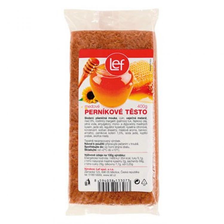 PŠENIČNÁ MÚKA, cukor, VAJEČNÁ MELANŽ, med 8%, rastlinný margarín (palmový tuk, repkový olej, pitná voda, emulgátory: mono- a diglyceridy mastných kyselin, jedlá sol, regulátor kyselosti: kyselina citronová, konzervant: sorban draselný, maslová aróma, barvivo: annatto), perníkové korenie 1,5%, soda jedlá, kypriaci prášok, škorica mletá