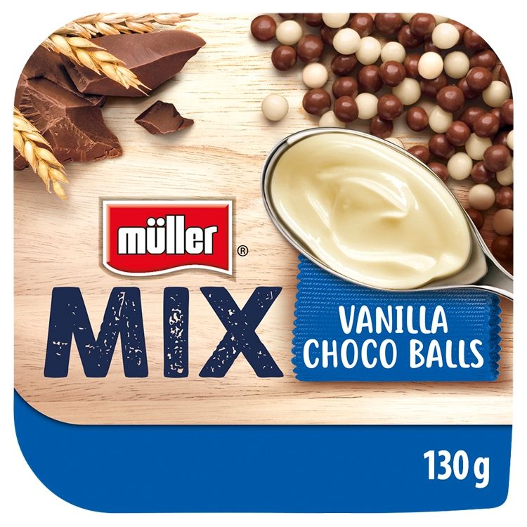 Jogurt (mlieko, jogurtové kultúry), Voda, Cukor, Kakaové maslo, Sušené mlieko, Ryžová múka, Pšeničná múka, Kakaová hmota, Modifikovaný škrob, Poleva: arabská guma, Jačmenný slad, Emulgátor: sójový lecitín, Sušená srvátka, Laktóza, Jedlá soľ, Mliečna bielkovina, Zahusťovadlo: pektíny, Farbivo: karotén, Kyselina: kyselina citrónová, Regulátor kyslosti: citrany sodné, Vanilkový prášok, Aróma