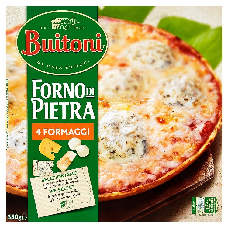 pšeničná múka, sekané rajčiny 22%, syr ementál 14%, syr mozzarella 12%, pitná voda, odtučnený tvaroh, repkový olej, tvrdý syr 2%, smotana, kyslá smotana - créme fraiche, droždie, syr s modrou plesňou 0,9%, plnotučné mlieko, jedlá soľ, sušené mlieko plnotučné, cukor, koreniny, modifikovaný kukuričný škrob,