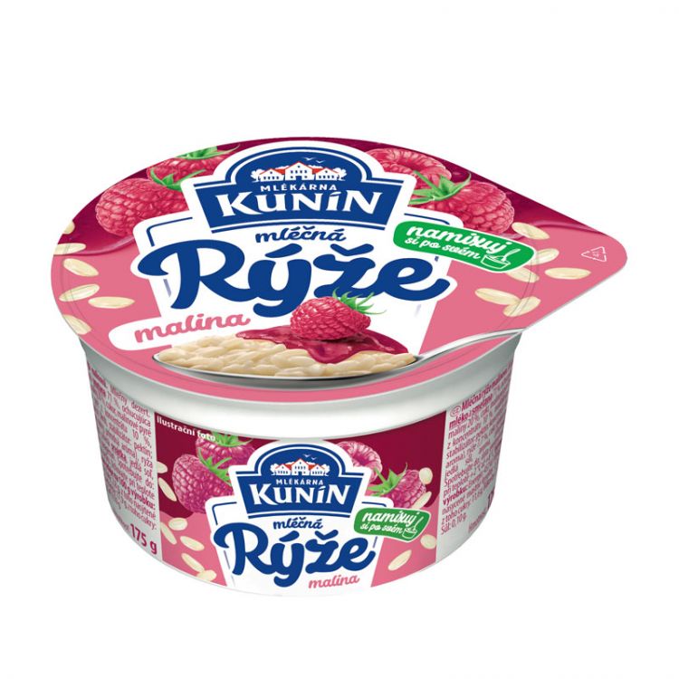 MLIEKO a SMOTANA 71 %, malinová zložka 17 % (voda, maliny 30 %, cukor, malinové pyré z koncentrátu 10 %, stabilizátory: modifikovaný kukuričný škrob, pektíny; koncentrát z čiernej mrkvy, prírodná aróma), ryža 7,7 %, cukor, glukóza, sušená SRVÁTKA, jedlá soľ, aróma, zahusťovadlo: karagénan