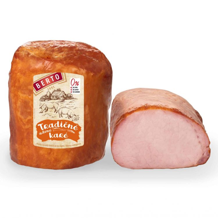 bravčové karé bez kosti, povrch výrobku červenohnedej farby , bez hlbších zárezov, vôňa po udení, na reze ružovočervenej farby, konzistencia pružná, chuť primerane slaná.