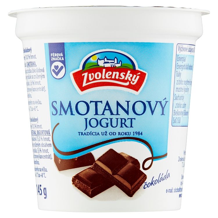 Jogurtová zložka (smotana, jogurtová kultúra), Ochucujúca zložka čokoládová 15,0 % hmot. [cukor, voda, kakaový prášok so zníženým množstvom tuku, čokoláda v prášku 5,6 % hmot. (kakao, cukor), kukuričný škrob, citrónový koncentrát], Tuk v mliečnej zložke najmenej 10,0 % hmot.