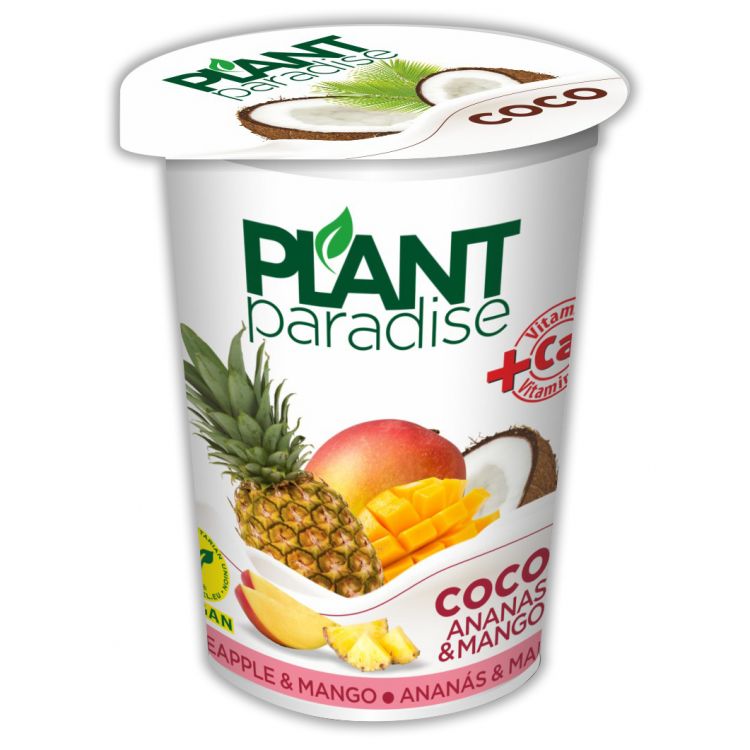 Fermentovaný kokosový výrobok ,kokosové mlieko (voda,kokosový extrakt)ovocie 7%(4%ananas,3%mango)cukor,modifikovaný škrob,prírodná aroma,vegánske jogurtové kultúry