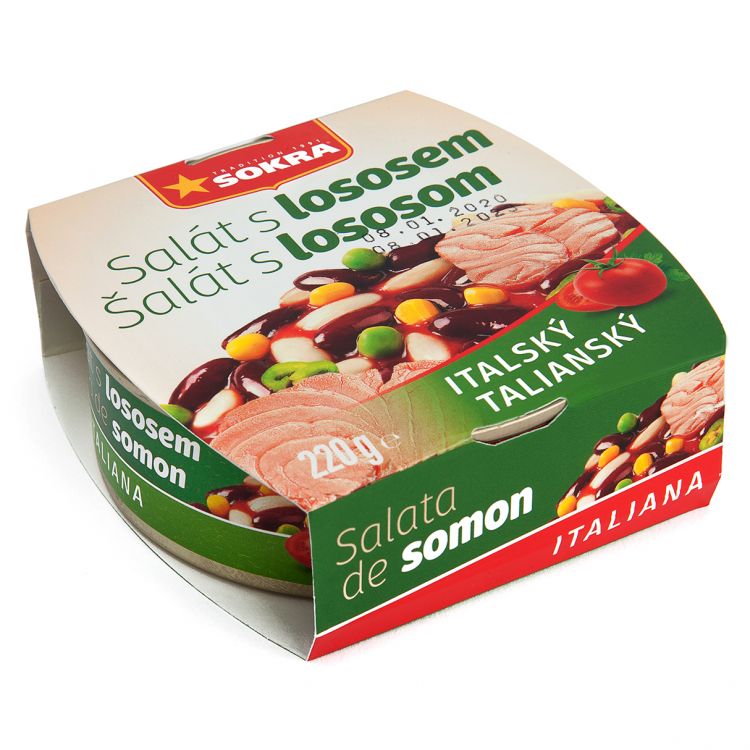losos (Salmo salar) – 20 %, zeleninová zmes – 41 % (biela a červená fazuľa, mrkva, zelený hrášok, kukuricca, cibuľa, zelér), pitná voda, paradajková pasta – 6 %, cukor, jedlá soľ, repkový olej, zahusťovadlá: modifikovaný kuričný škrob, stabilizátory: karubín, guarová guma a karboxymethylcelulóza, zmes korenia (čierne korenie, koriander, bobkový list, nové korenie), regulátor kyslosti: kyselina octová.