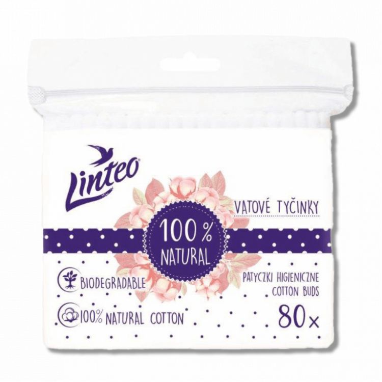 Vatové tyčinky Linteo sú balené vo vrecku po 80 kusoch. Sú vyrobené zo 100 % bavlny + 100 % recyklovaný papier.