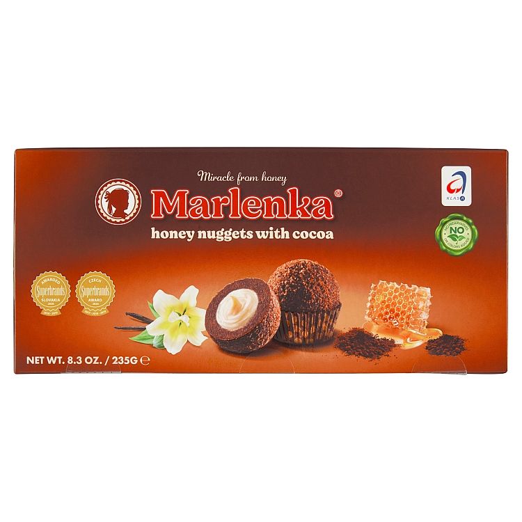 Zahustené mlieko sladené s kakaom (mlieko, cukor, glukozový sirup, kakao so zníženým obsahom tuku), Margarín [palmový tuk, voda, plne stužený kokosový tuk, repkový olej, emulgátory (mono- a diglyceridy mastných kyselín, slnečnicové lecitíny), regulátor kyslosti (kyselina citrónová), jedlá soľ, aróma], Obohatená pšeničná múka (pšeničná múka, fumarát železnatý, niacín, vitamín B1, vitamín B2, kyselina listová), Cukor, Vaječná melanž, Med 2,6 %, Kakao so zníženým obsahom tuku 1,2 %, Voda, Poleva [cukor, čiastočne stužený rastlinný tuk (palmojadrový, palmový, bambucký), sušené odstredené mlieko, kakaový prášok so zníženým obsahom tuku, sušená srvátka, emulgátory (sójové lecitíny, polyglycerol-polyricín-oleát), vanilkový extrakt], Repkový olej, Kypriaca látka hydrogénuhličitan sodný, Nevlhnúci cukor (cukor, pšeničný škrob, palmový tuk), Žĺtok sušený, Cesto z odpaľovanej hmoty [pšeničný škrob, repkový a palmový olej, vaječná zmes sušená, kukuričný škrob, glukózový sirup, vaječný bielok sušený, kypriace látky (hydrogénuhličitan sodný, dihydrogénuhličitan sodný), mliečne bielkoviny, jedlá soľ], Kvasný ocot liehový, Jedlá soľ, Aróma (ethylvanilín), Prírodná vanilková aróma
