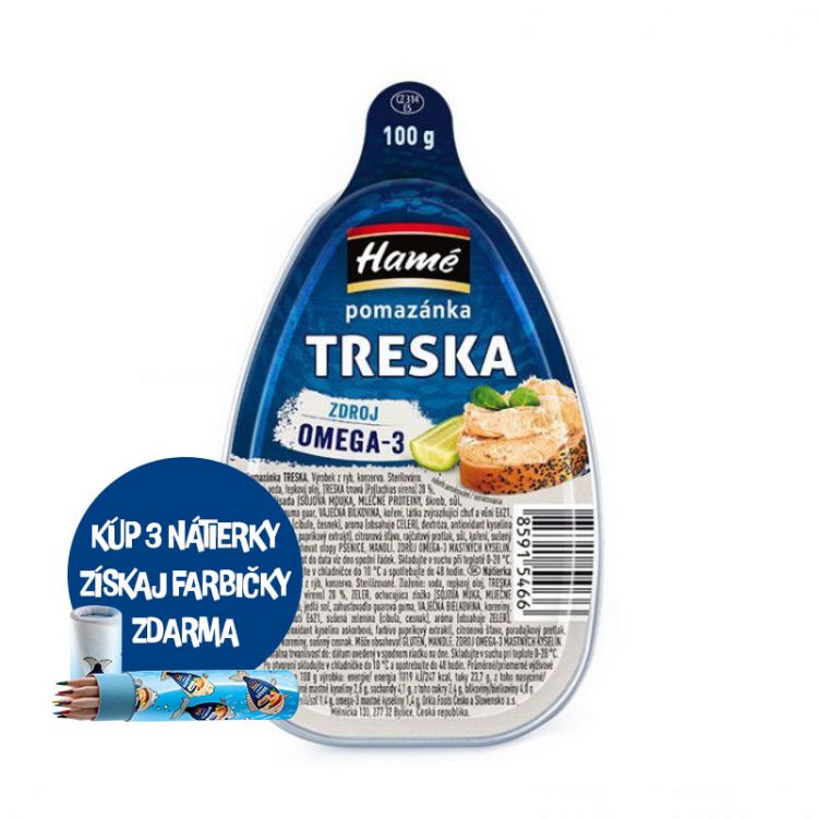 Zloženie: voda, repkový olej, TRESKA tmavá (Pollachius virens) 20 %, ZELER, ochucujúca zložka (SÓJOVÁ MÚKA, MLIEČNE BIELKOVINY, škrob, jedlá soľ, zahusťovadlo: guarová guma, VAJEČNÁ BIELKOVINA, koreniny, zvýrazňovač chuti: E621, sušená zelenina (cibuľa, cesnak), aróma (obsahuje ZELER), dextróza, antioxidant: kyselina askorbová, farbivo: paprikový extrakt), citrónová šťava, paradajkový pretlak, jedlá soľ, koreniny, sušený cesnak.