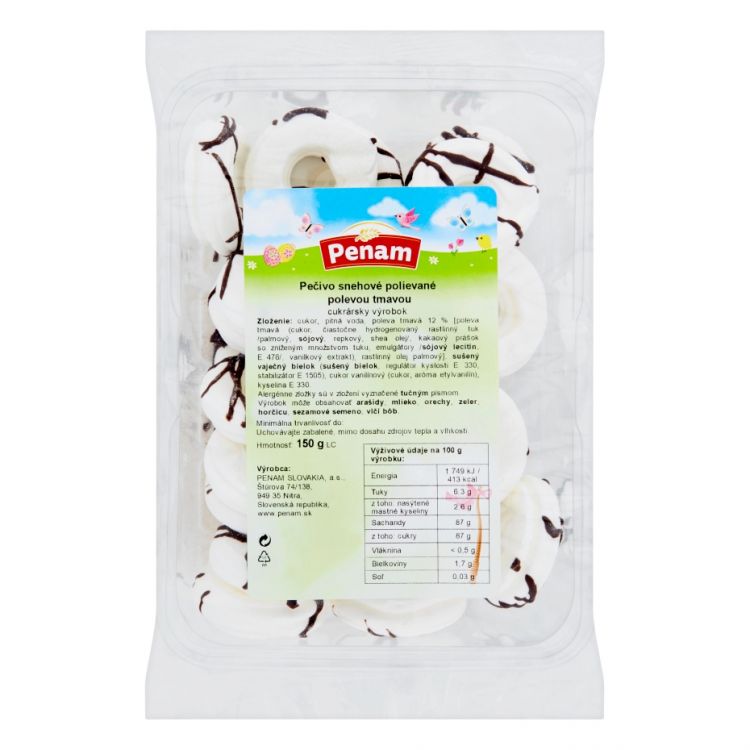 cukor kryštálový, cukor práškový (cukor, pitná voda, zemiakový škrob), pitná voda, poleva tmavá 9 % (cukor, rastlinný tuk /palmojadrový, palmový a shea/, kakaový prášok so zníženým množstvom tuku, emulgátory /sójový lecitín, E 476/, vanilkový extrakt), cukrárska zmes (sušený vaječný bielok, cukor, regulátor kyslosti E 330), cukor vanilínový (cukor, aróma etylvanilín), kyselina E 330.