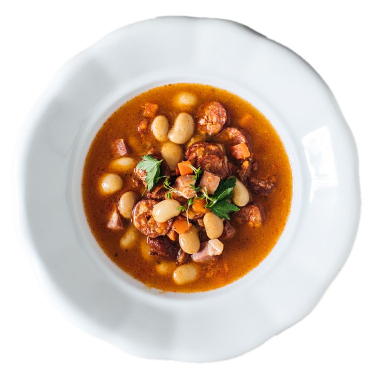 pitná voda, údené bravčové plece (SK) 9,6 %, údená klobása (SK) 9,6 % (bravčové a hovädzie mäso /na 100 g hotového výrobku bolo použité 114 g bravčového mäsa a 18 g hovädzieho mäsa/, prírodné koreniny, cukor kryštál), fazuľa biela 8,4 %, cibuľa, mrkva, zemiakový škrob, bravčová masť, cesnak, červená paprika mletá, slepačí bujón, jedlá soľ, petržlenová vňať, čierne korenie.