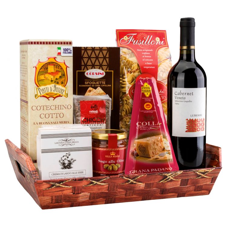 Biele víno Veneto IGT Chardonnay „Le Morre“ 750 ml Červené víno Veneto IGT Merlot „Le Morre“ 750 ml Cestoviny Pennoni z tvrdej pšenice „Dalla Costa“ 250 g Olivová omáčka „Villa Reale“ 180 g Tarallini Paradajka a oregano „Terre di Puglia“ 100 g Šošovica „Melandri“ 250 g Saláma Cotechino „Salumificio Vecchi“ 250 g Grana Padano 16 mesiacov „Colla“ cca 150 g