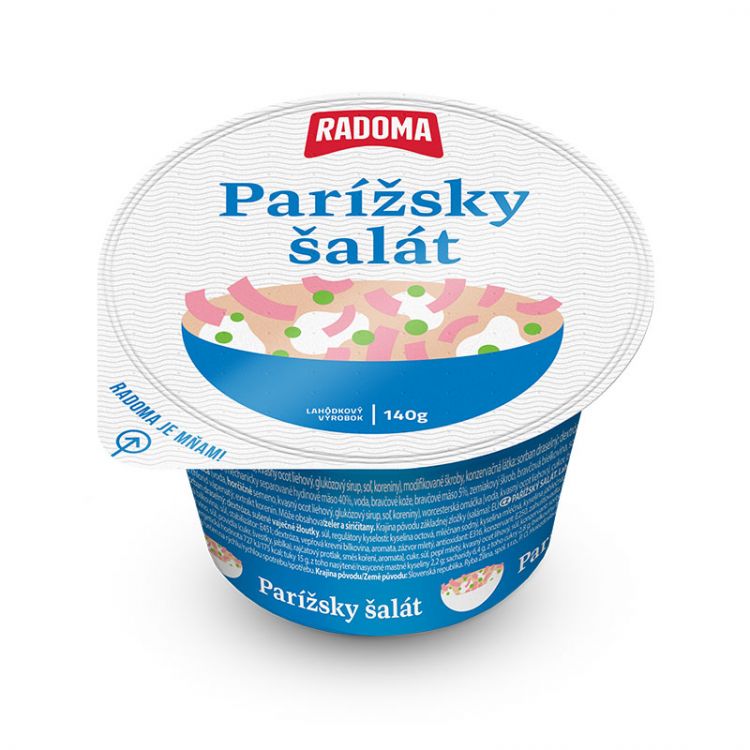 majonézová omáčka (pitná voda, repkový olej, modifikovaný škrob, kvasný ocot liehový, sušené VAJEČNÉ ŽĹTKY, cukor, jedlá soľ, zahusťovadlá: E412, E415, regulátory kyslosti: mliečnan sodný, kyselina mliečna, konzervačná látka: sorban draselný, dextróza), mäkký mäsový výrobok - saláma (mechanicky separované hydinové mäso 40%, pitná voda, bravčové kože, bravčové mäso 5%, zemiakový škrob, bravčová bielkovina, jedlá soľ, stabilizátor: E451, dextróza, farbivo: bravčový krvný proteín, arómy, zázvor mletý, antioxidant: E316, konzervačná látka: E250, zahusťovadlá: E415, E412, extrakty korenín), zelenina v rôznom pomere (kvaka, cibuľa, hrášok, uhorky), HORČICA (pitná voda, HORČIČNÉ semeno, kvasný ocot liehový, glukózový sirup, jedlá soľ, koreniny), jedlá soľ, cukor, worcesterová omáčka, čierne korenie mleté.