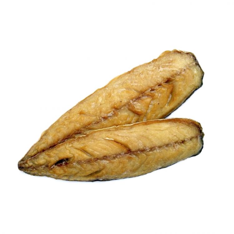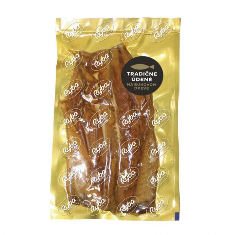 Svalovina údenej makrelovej filety zlatohnedej farby, s kresbou typickou pre použitý surovinu- makrelu.