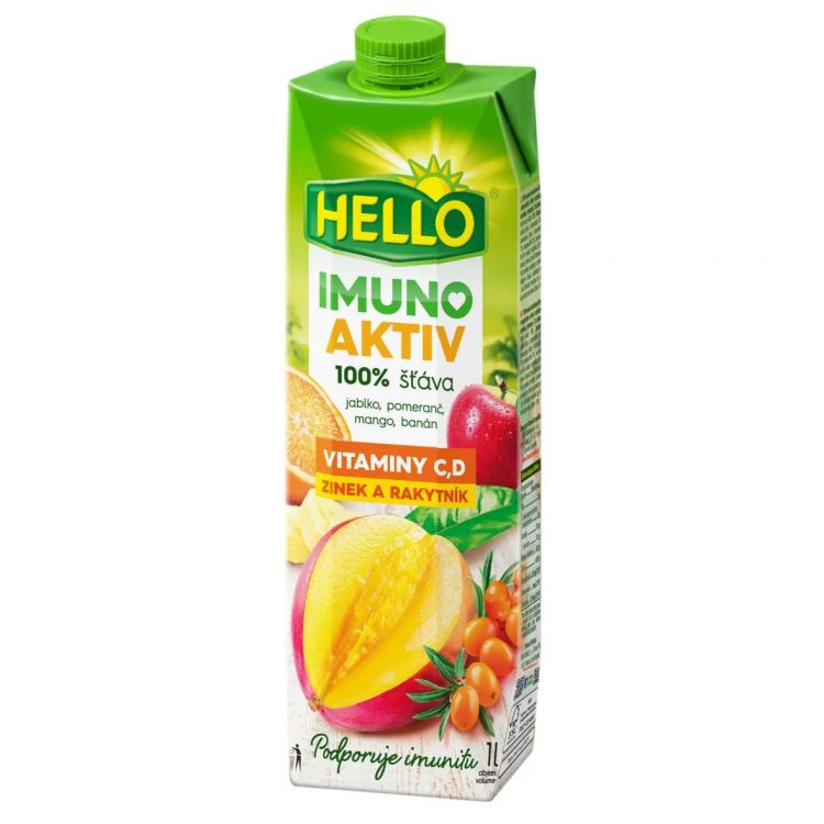 100% ovocná viacdruhová šťava z koncentratu, jablčná šťava 43%, pomarančová šťava 37%, mangová dreň 15%, bananová dreň 5%, Extrakt z rakytníka 0,05% vitamín C, vitamín D, zinok
