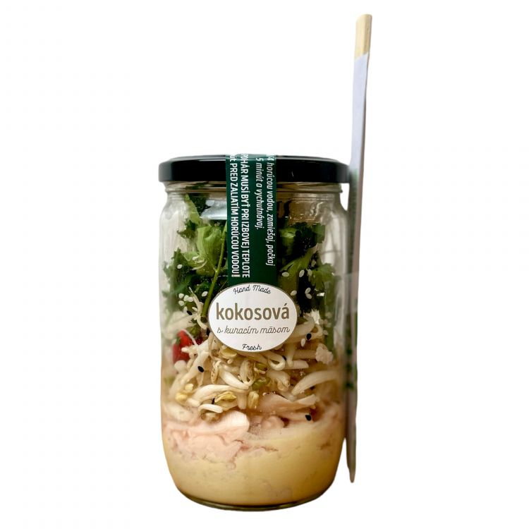 Prenes sa na pláže Thajska. Veľký sklenený pohár s čerstvou zeleninou a ingredienciami, ktoré sú potrebné pre autentickú kokosovú polievku už vrátane ochucovadla (omáčka, koreniny). Stačí len zaliať horúcou vodou, pomiešať a hotovo. Rýchla, skvelá a sýta polievka.