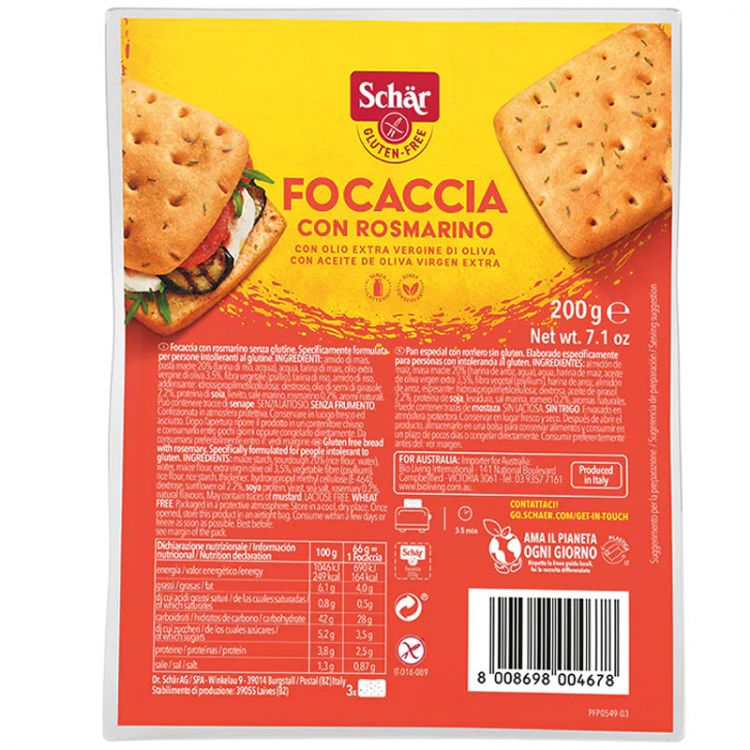 Pitná voda, Kukuričný škrob, Ryžový kvások 20% (ryžová múka, ryžový škrob), Kukuričná múka, Extra panenský olivový olej 3,5%, Rastlinná vláknina (psyllium), Ryžová múka, Slnečnicový olej, Ryžový škrob, Dextróza, Sójová bielkovina, Pekárske droždie, Morská soľ, Rozmarín 0,2%, Zahusťovadlo: hydroxypropylmethylcelulóza