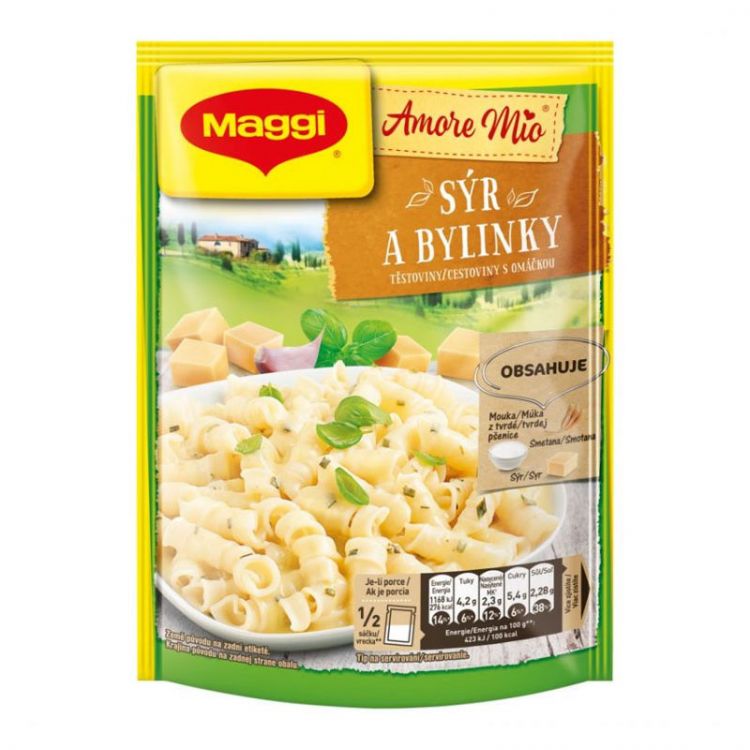 Múka z tvrdej pšenice 55 %, pšeničná múka, sušené mlieko odtučnené, sušená smotana 3,2 %, jedlá soľ, syrový prášok 2,4 % (syry: Camembert 1,3 %, dánsky syr 0,9 %, Ementál 0,1 %, Gouda 0,1 %), kukuričný škrob, sušená mletá zelenina (cibuľa, cesnak 0,2 %), slnečnicový olej 0,9 %, cukor, sušená pažítka 0,3 %, arómy (obsahujú mlieko, laktózu), sušený kvasnicový výťažok, sušená srvátka, sušená bazalka 0,04 %, kurkuma, minerálna látka (jodičnan draselný), % - vztiahnuté na obsah zložky v celom výrobku