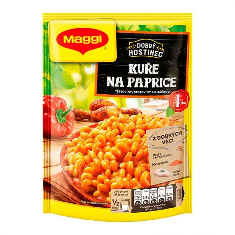 Múka z tvrdej pšenice 52 %, pšeničná múka, sušené mlieko plnotučné, mletá sladká paprika 2,8 %, jedlá soľ, zemiakový škrob, kuracie mäso prášok 2,2 %, sušená mletá zelenina (cibuľa, cesnak), sušený kvasnicový výťažok, kurací tuk 1,4 %, cukor, arómy, antioxidant (extrakty z rozmarínu), minerálna látka (jodičnan draselný), % - vztiahnuté na obsah zložky v celom výrobku