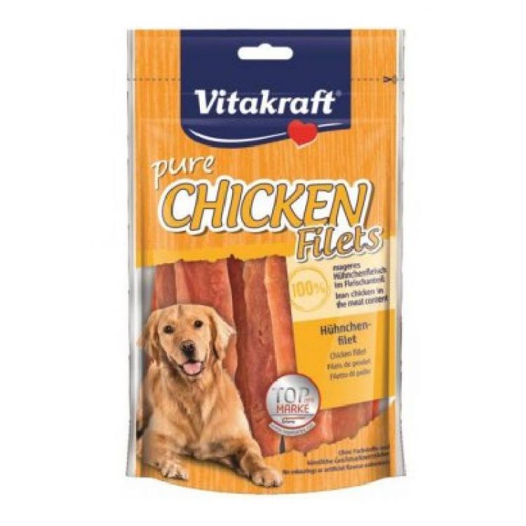 CHICKEN FILETS. Doplnkové krmivo pre psov vyrobené z 100% chudého kuracieho filé. Žuvacia pochúťka zo 100% kuracieho mäsa ideálna ako odmena. Bez pridaného cukru, sóje, vajec, mliečnych výrobkov a mäsovej múky. Bez pridania farbív a konzervačných látok.
