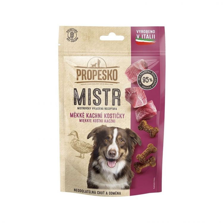 mäso a vedľajšie produkty živočíšneho pôvodu (min. 60 %, z toho kačacina min. 8 %), vedľajšie produkty rastlinného pôvodu, oleje a tuky, propylénglykol.Vlhkosť 22 %, dusíkaté látky 35 %, obsah tuku 11 %, popol 13%, vláknina 1 %. vitamín A 12000 m.j., vitamín D3 1000 m.j., vitamín E 90 mg, vitamín B 1 2,7 mg, vitamín B 2 3,8 mg, vitamín B 6 1,8 mg, vitamín B 12 0,03 mg, Niacin 17,5 mg, D-pantotenát vápenatý 10 mg, kyselina listová 1,2 mg, L-karnitín 490 mg,m.j. = medzinárodné jednotky