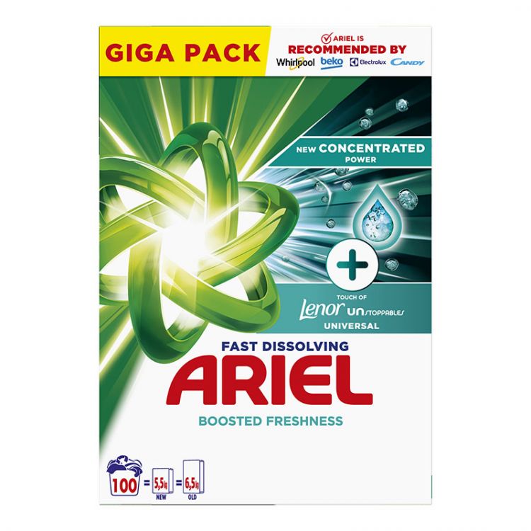 Ariel, značka, ktorú odporúčajú výrobcovia práčok Whirlpool, Electrolux, Candy a Beko, predstavuje rýchlorozpustný prášok na pranie Ariel + Touch of Lenor Unstoppables Universal. Prací prášok Ariel s koncentrovaným zložením poskytuje koncentrovanejšiu silu a operie viac bielizne na jeden gram prostriedku. Ariel + Touch of Lenor Unstoppables dodáva bielizni intenzívnu sviežosť a zaisťuje výnimočnú čistotu dokonca aj pri praní na nižších teplotách. Vďaka jedinečnej technológii rýchlorozpúšťania sa pri kontakte s vodou rýchlo rozpustí, ihneď aktivuje a preniká hlboko do vlákien aj pri praní na nižších teplotách. Znížte teplotu prania na 30 °C a ušetrite až 60 % energie. (Spotreba energie práčkou pri prechode zo 60 °C na 30 °C, bežný cyklus). Programy na pranie pri nižších teplotách pomáhajú chrániť vašu bielizeň dlhšie ako programy na pranie pri vyšších teplotách. Zloženie s obsahom biologicky odbúrateľných zložiek (80 % všetkých organických zložiek je biologicky odbúrateľných). Navyše má prací prášok Ariel + Touch of Lenor Unstoppables Universal úplne recyklovateľný kartónový obal vyrobený z papiera s 80 % podielom recyklovaného materiálu.