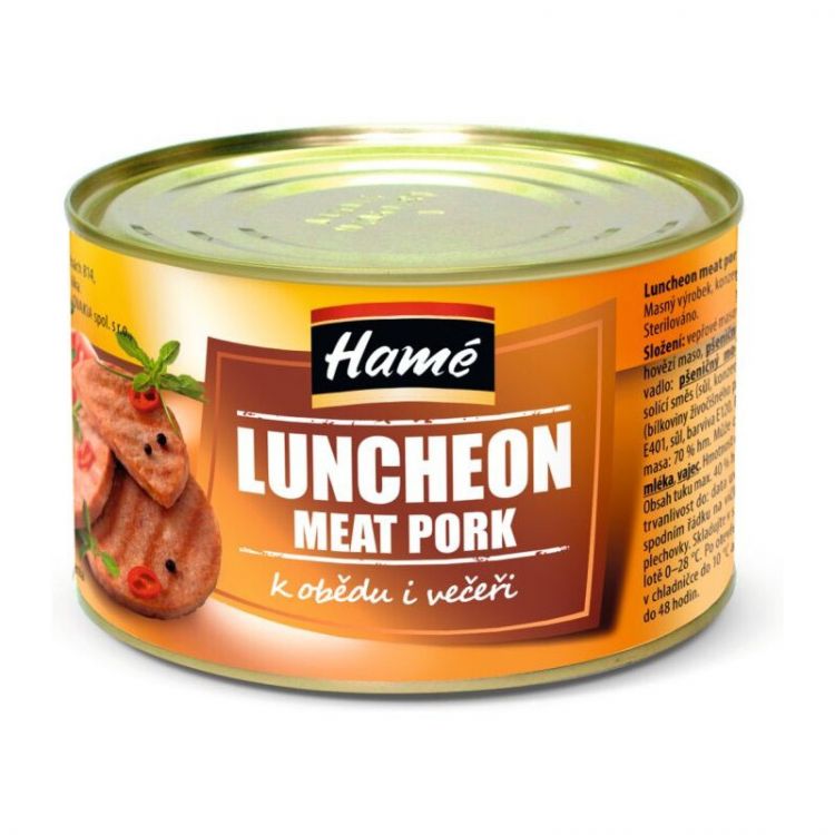 Zloženie: bravčové mäso (70 %), bravčové kože, voda, hovädzie mäso (5 %), PŠENIČNÁ MÚKA, PŠENIČNÝ MODIFIKOVANÝ ŠKROB, soliaca zmes (jedlá soľ, konzervačná látka: E 250), koreniaci prípravok (koreniny, sušený ZELER, extrakty korenín), bravčová bielkovina.