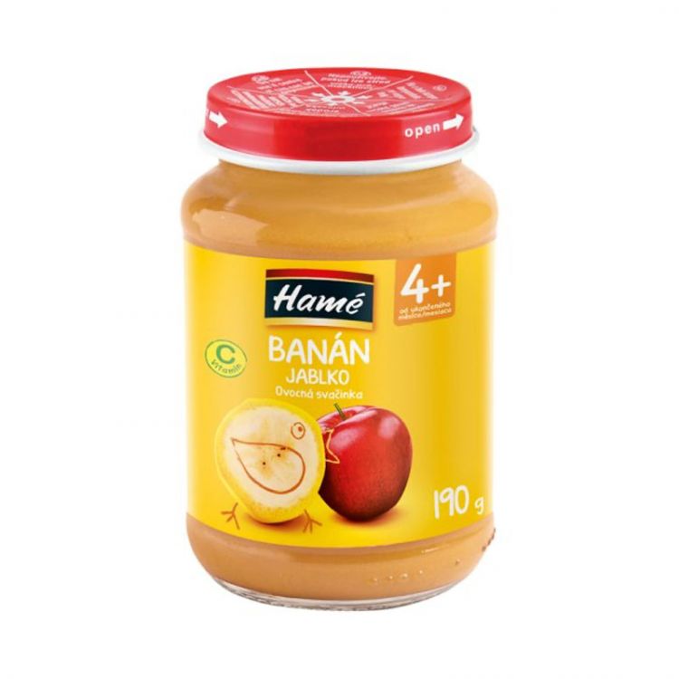 Zloženie: banány (33 %), voda, jablká (22 % ), fruktózo-glukózový sirup, modifikovaný kukuričný škrob, regulátor kyslosti: kyselina citrónová, antioxidant: kyselina askorbová, vitamín C.