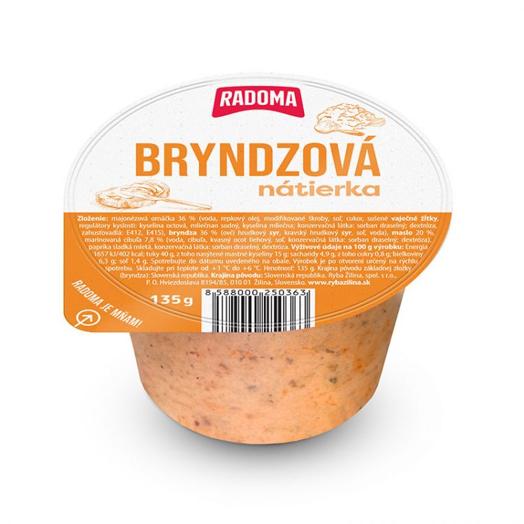 majonézová omáčka 36% (pitná voda, repkový olej, zahusťovadlá: E412, E415; jedlá soľ, cukor, modifikované škroby, sušené vaječné žĺtky, regulátory kyslosti: kyselina octová, mliečnan sodný, kyselina mliečna; konzervačná látka: sorban draselný; dextróza), bryndza 36% (ovčí hrudkový syr, kravský hrudkový syr, jedlá soľ, voda), maslo 20%, marinovaná cibuľa 7,8% (pitná voda, cibuľa, kvasný ocot liehový, jedlá soľ, konzervačná látka: sorban draselný; dextróza), paprika sladká mletá, konzervačná látka: sorban draselný, dextróza.