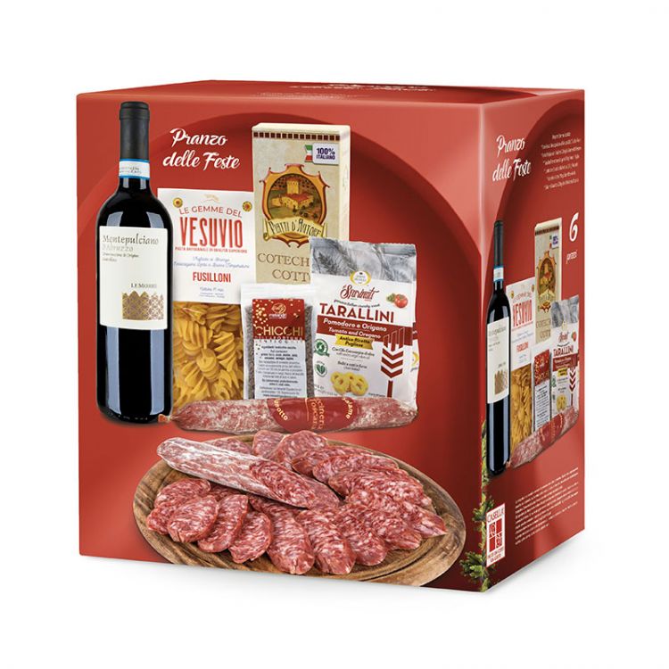 Červené víno Veneto IGT Cabernet „Le Morre“ 750 ml Cestoviny Pennoni z tvrdej pšenice „Dalla Costa“ 250 g Tarallini Paradajka a oregano „Terre di Puglia“ 100 g Šošovica „Melandri“ 250 g Saláma Cotechino „Salumificio Vecchi“ 250 g Saláma „Salumi Caputo“ 200 g