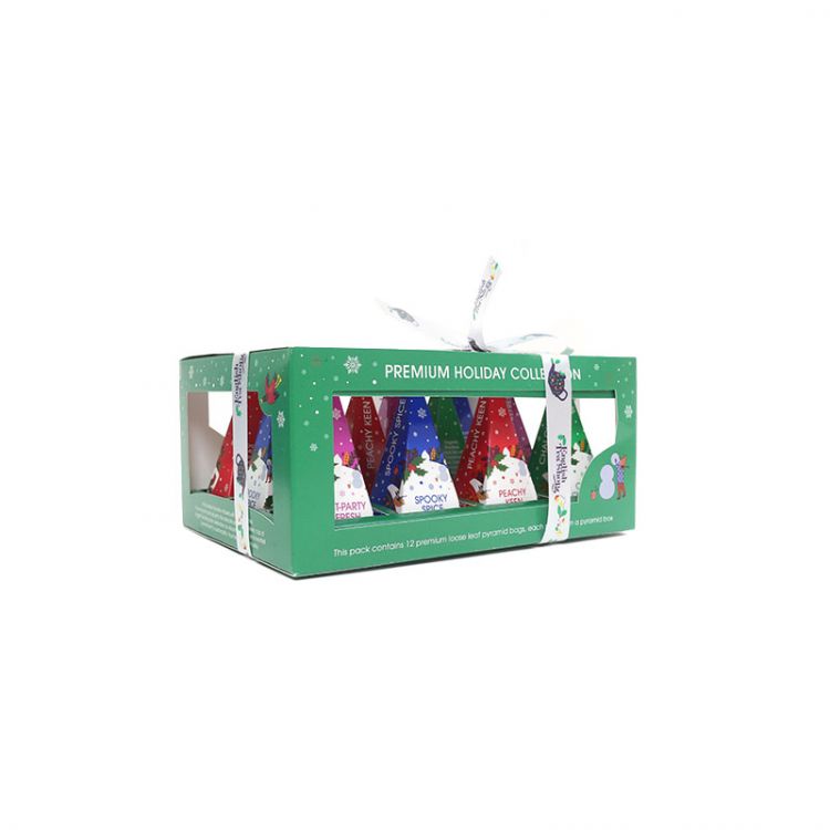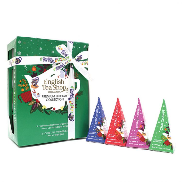 Darčeková kolekcia BIO sypaných čajov v pyramídových vrecúškach. Darčeková kolekcia obsahuje: Chai Charge - Bio bylinný čaj rooibos so škoricou, klinčekmi, kurkumou, kardamónom, cesnakom a kvetom modrej kukurice, aromatizovaný, porciovaný. Zloženie: Bio rooibos (56%), bio škorica (15.75%), bio klinčeky (12%), bio kurkuma (6%), bio kardamóm (4%), prírodná jahodová aróma (3%), prírodná škoricová aróma (1.25%), bio cesnak (1%), bio kvet modrej kukurice (1%). Príprava čaju: luhovanie 3-5 minút/200 ml vody. Peachy Keen - Bio bylinno-ovocný čaj z ibišteka so šípkami, citrónom, citrónovou trávou, škoricou a jablkom, aromatizovaný, porciovaný. Zloženie: Bio ibištek (55%),bio šípky (20%), bio citrónová kôra (5%), bio citrónová tráva (5%), bio škorica (5%), bio jablko (5.5%), prírodná broskyňová aróma (3.5%), prírodná aróma marakuje (1%). Príprava čaju: luhovanie 3-5 minút/200 ml vody. Spooky Spice - Bio zelený čaj so škoricou, zázvorom, kardamónom, klinčekmi, muškátovým orieškom a korením, aromatizovaný, porciovaný. Zloženie: Bio zelený čaj (78%), bio škorica (5.5%), bio zázvor (2.5%), bio kardamóm (2.5%), bio klinčeky (2.5%), bio muškátový oriešok (2.5%), bio korenie (2.5%), prírodná aróma graviole (2.5%), prírodná pomarančová aróma (1.5%). Príprava čaju: luhovanie 2-3 minúty/200 ml vody. Post-party Refresh - Bio zelený čaj so škoricou, garcíniou a bobulami acai, aromatizovaný, porciovaný. Zloženie: Bio zelený čaj (64%), bio garcínia (17%), bio škorica (13%), prírodná aróma granátového jablka (2.5%), prírodná ananásová aróma (2.5%), bio bobule acai (1%). Príprava čaju: luhovanie 2-3 minúty/200 ml vody. Balenie: 12 ks
