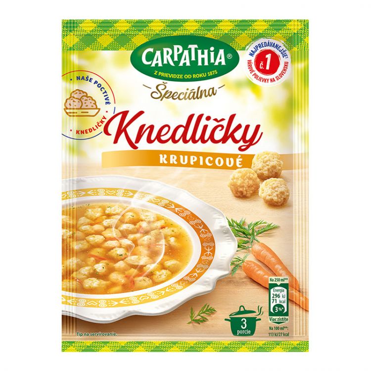 Zloženie: PŠENIČNÁ krupica 44,7 %, hovädzí tuk, jódovaná jedlá soľ (jedlá soľ, jodičnan draselný), sušené VAJEČNÉ BIELKY a ŽĹTKY; kukuričný škrob, zvýrazňovače chuti (glutaman sodný, inozínan disodný, guanylan disodný), sušená zelenina (mrkva 2,2 %, cibuľa, ZELER), PŠENIČNÝ GLUTÉN, cukor, palmový tuk, arómy, slnečnicový olej, sušená petržlenová vňať, farbivá (amoniakový sulfitový karamel, riboflavíny), regulátor kyslosti (kyselina citrónová), muškátový orech, antioxidant (extrakty z rozmarínu). % - vztiahnuté na obsah zložky v celom výrobku.