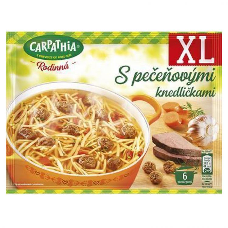 Zloženie: múka z tvrdej PŠENICE, jódovaná jedlá soľ (jedlá soľ, jodičnan draselný), PŠENIČNÁ múka, PŠENIČNÁ krupica, sušené bravčové mäso, zvýrazňovače chuti (glutaman sodný, inozínan disodný, guanylan disodný), sušená zelenina (mrkva 2,5 %, cibuľový prášok, cesnak 0,8 %), palmový tuk, sušené VAJEČNÉ BIELKY a ŽĹTKY; sušená bravčová pečeň 2,1 %, maltodextrín, PŠENIČNÝ GLUTÉN, jedlá soľ, arómy, cukor, slnečnicový olej, koreniny (majorán, čierne korenie), sušená petržlenová vňať, farbivá (obyčajný karamel, amoniakový sulfitový