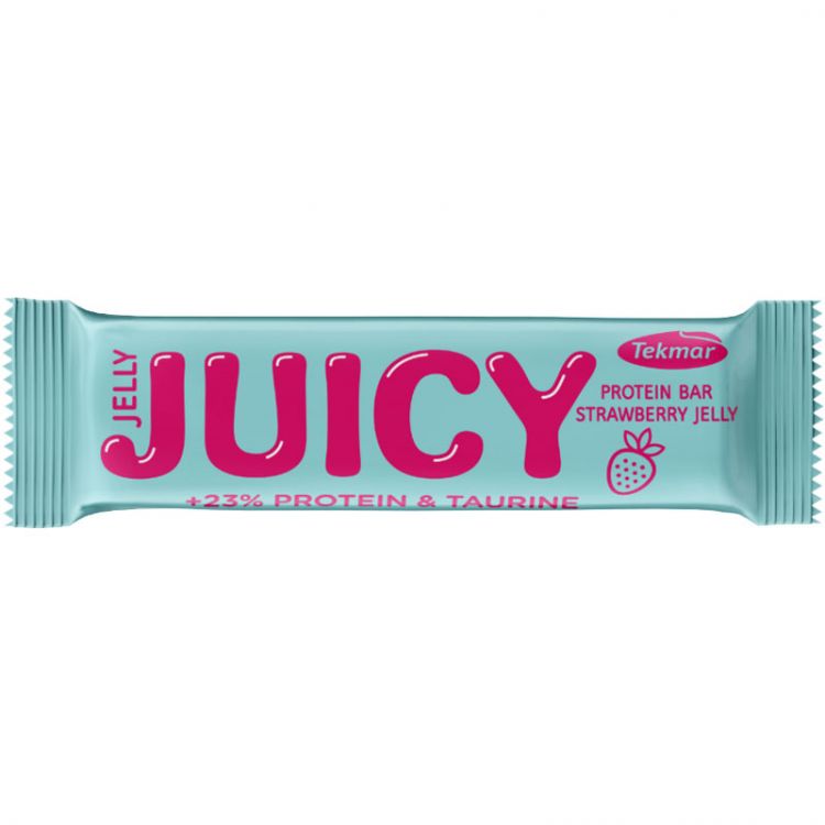 kakaová poleva 25% (palmový tuk, zahusťovadlo: polydextróza (vláknina), mliečne bielkoviny, kakaový prášok 8%, emulgátor: lecitíny, prírodná aróma, sladidlo: sukralóza), kukuričná vláknina, jahodové želé 16% (glukózový sirup, dextróza, cukor, koncentrovaná jahodová šťava 2%, koncentrát mrkvy a ibišteka, želírujúca látka: pektíny, regulátor kyslosti: citrany sodné, kyselina: kyselina citrónová, aróma), sójový extrudát (sójový bielkovinový izolát), sójový bielkovinový izolát, dextróza, sojové vločky, sušené jablká (jablká, konzervačná látka: oxid siričitý, antioxidant: kyselina citrónová), palmový tuk, taurín, repkový olej, emulgátor: slnečnicový lecitín, kyselina: kyselina citrónová, regulátor kyslosti: kyselina mliečna, soľ, arómy.