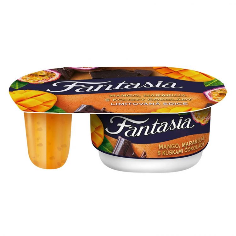 Jogurt (odstredené mlieko, smotana, cukor, sušené odstredené mlieko, jogurtové kultúry), ovocná zložka s čokoládovými kúskami 22 % [ ovocie 40 % (mango 28,3 %, jablčné pyré 7,9 %, marakujové pyré 3,8 %), voda, cukor, čokoláda 4 % (kakaová hmota, kakaové maslo, cukor), modifikovaný škrob, zahusťovadlá (pektíny, xantánová guma), regulátory kyslosti (citrany sodné, kyselina citrónová,citrany vápenaté), koncentrovaná mrkvová šťava, prírodné arómy]. Môže obsahovať stopy lepku, vajec, arašidov, sóje a orechov.