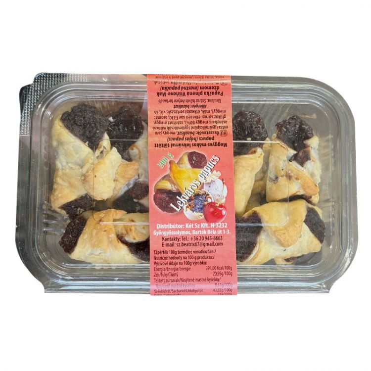 Pšeničná múka, jedlý tuk, voda, višňový džem/ovocné pyré ,jablko sušená višňa,glukózový sirup,cukor, kyselina citrónová,E330, aróma/,mak, soĺ ,ocot,zlepšujúce činidlo E341,E300,aróma-višňa