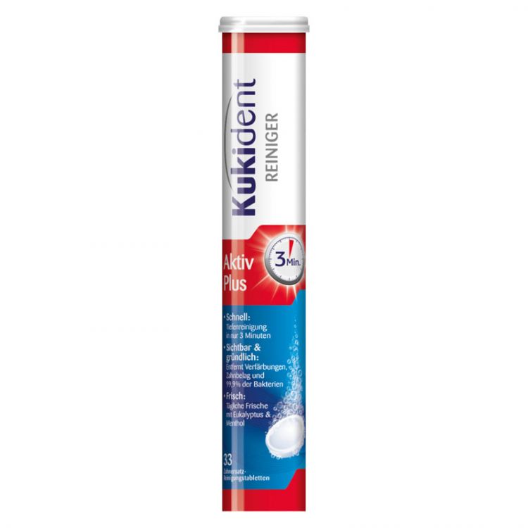 Protézu opláchnite a vložte do pohára spolu s tabletou Kukident Intensive. 2. Pridajte teplú vodu tak, aby bola protéza úplne zakrytá a nechajte čistiaci roztok pôsobiť 10-15 minút.