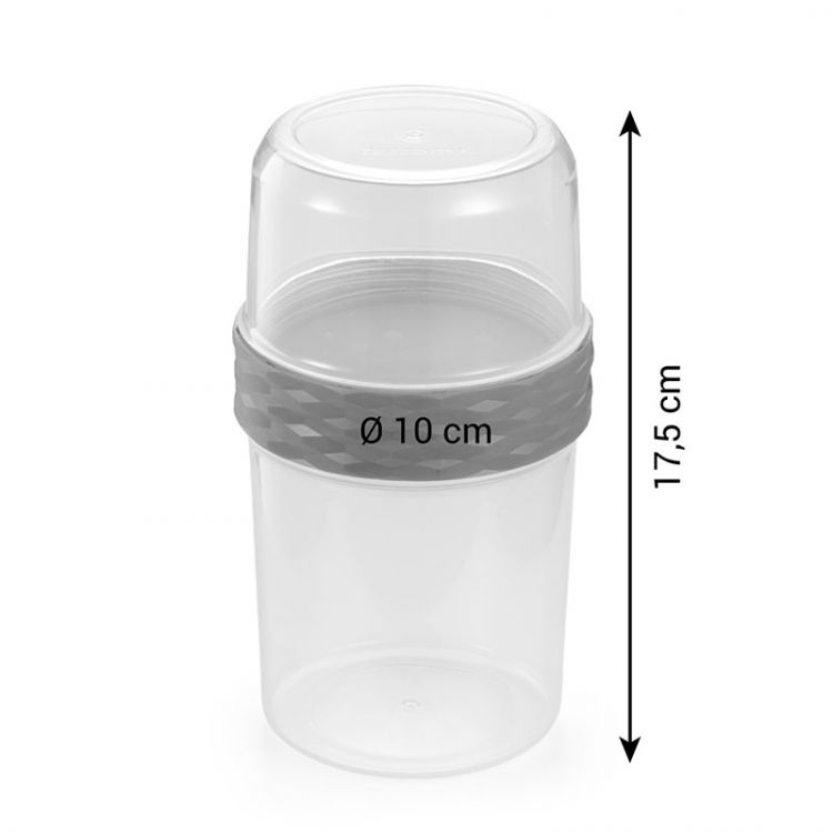 Vynikajúca na oddelené uloženie, bezpečné prenášanie a hygienické podávanie pokrmov. Vyrobená z odolného plastu, vybavená stupnicou a obojstranným skrutkovacím uzáverom s kvalitným silikónovým tesnením. Vhodná do umývačky.