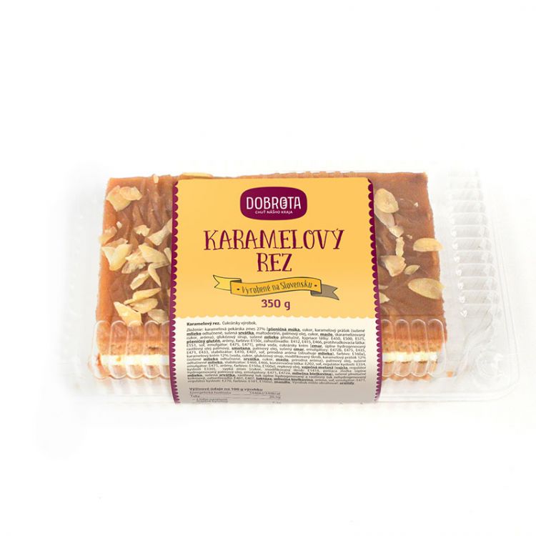 Zloženie produktu karamelový krém (30,5%) [voda, cukor, glukózový sirup, modifikovaný škrob, karamelový prášok 12% (sušené mlieko odtučnené, srvátka, cukor, maslo, prírodná aróma), palmový olej, sušené odtučnené mlieko, stabilizátor: E460, E466, konzervačná látka: E202, soľ, regulátor kyslosti: E334, emulgátor: E475, arómy, farbivo: E150a, E160a], karamelová pekárska zmes (15,3%) [pšeničná múka, cukor, karamelový prášok (sušené mlieko odtučnené, sušená srvátka, maltodextrín, palmový olej, cukor, maslo, skaramelizovaný cukor, aróma), glukózový sirup, sušené mlieko plnotučné, kypriace látky: E450, E500, E575, pšeničný glutén, arómy, farbivo: E150c, zahusťovadlo: E412, E415, E466, protihrudkovacia látka: E551, soľ, emulgátor: E475, E471], vaječná melanž (12,2%) [vajcia, regulátor kyslosti E330], cukrárska zmes (11,4%) [cukor, pšeničná múka, pšeničný škrob, kypriace látky: E500, E575, difosforečnany: E450, emulgátory: E471, E475, glukózový sirup; soľ, zahusťovadlo: E415, farbivo: E160a], rastlinný margarín (9,9%) [palmový, kokosový a repkový olej, voda, emulgátory: E322, E471, fermentované odtučnené mlieko, maslová aróma, konzervačná látka: E202, kyselina: E330, vitamín A, farbivo: E160a], glazúra s karamelovou príchuťou (7,6%) [cukor, palmový tuk, kokosový olej, laktóza, sušená srvátka, kakaový prášok so zníženým množstvom tuku, emulgátor: E322 sójový lecitín, paprikový extrakt, prírodná aróma, farbivo E160a], repkový olej (6,1%), pitná voda (5,4%), lotus sušienková drť (1,5%) [pšeničná múka, cukor, palmový a repkový olej, kandis sirup, kypriaca látka: E500, jedlá soľ, škorica], konzervačná látka: E200 (0,1%). Výrobok môže obsahovať arašidy, orechy.