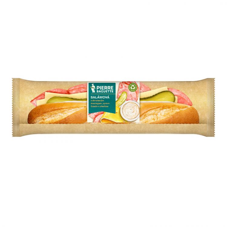 Pšeničná bageta 43% (PŠENIČNÁ múka 59%, voda, rastlinný olej (repkový alebo slnečnicový), pekárske droždie, jedlá soľ, cukor, PŠENIČNÝ GLUTÉN, prášok z aceroly, mleté SÓJOVÉ bôby), Saláma 21% (bravčové mäso 80%, hovädzie mäso 2%, voda, jedlá soľ, konzervačná látka: dusitan sodný; zmes korenín (čierne korenie, cesnak, koriander), stabilizátory: trifosforečnany, difosforečnany; modifikovaný škrob, želírujúce látky: karagénan, spracovaná chaluha Euchema; živočíšne proteíny, látka zvýrazňujúca chuť a vôňu: glutaman sodný; antioxidant: askorban sodný; farbivo: kyselina karmínová, karmíny), Chrenový dresing 17% (repkový olej, chren 23% (mletý chren 65%, voda, slnečnicový olej, cukor, ocot kvasný liehový, modifikovaný škrob, jedlá soľ, regulátor kyslosti: kyselina citrónová; aróma, konzervačná látka: DISIRIČITAN SODNÝ; antioxidant: kyselina askorbová), voda, cukor, semienko HORČICE, ocot kvasný liehový, VAJEČNÝ ŽĹTOK, jedlá soľ, modifikovaný škrob, zahusťovadlá: guarová guma, xantánová guma; maltodextrín, koreniny, chrenová aróma), Syr Gouda 10% (pasterizované MLIEKO, jedlá soľ, stabilizátor: chlorid vápenatý; mliekarenské kultúry), Sterilizovaná uhorka 9% (uhorky, voda, ocot kvasný liehový, cukor, jedlá soľ, extrakty korenín)