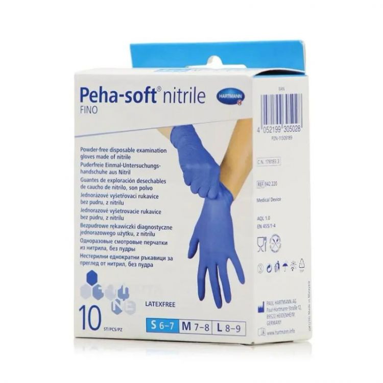 Vyšetrovacie rukavice Peha-soft NITRILE FINO z nitril kaučuku sú jemnejšie a zaisťujú tak maximálnu citlivosť v oblasti prstov. Minimalizujú možnosť alergických reakcií. Dávkovanie nie je stanovené. Nekĺzavý nitril ponúka tvarovú, dobre padnúcu a spolehlivú ochranu pre citlivú pokožku. Certifikované ako osobný, ochranný prostriedok aj na kontakt s potravinami. Poskytujú ochranu proti liogogickým patogénom, zriedeným chemikáliám, dezinfekčným a čistiacim prostriedkom.