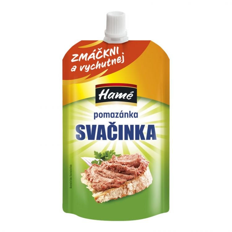 voda, bravčový tuk, bravčové kože, bravčová pečeň 15 %, bravčové mäso 8 %, modifikovaný škrob, soliaca zmes (soľ, konzervačná látka: dusitan sodný), stabilizátory (chlorid draselný, karagénan, karobová guma), ochucujúci prípravok (soľ, SÓJOVÝ HYDROLYZÁT, palmový olej, PŠENIČNÝ ŠKROB, cukor, hovädzí extrakt (soľ, hovädzí extrakt, repkový olej), sušená zelenina (cibuľa, ZELER, petržlenová vňať), sušené hovädzie mäso (hovädzie mäso, PŠENIČNÁ VLÁKNINA bezgluténová, rozmarínový extrakt), extrakty korenín (obsahuje PŠENIČNÚ MÚKU)), sušená cibuľa, bravčová bielkovina, aróma (soľ, kvasnicový extrakt, aróma, dymová aróma).