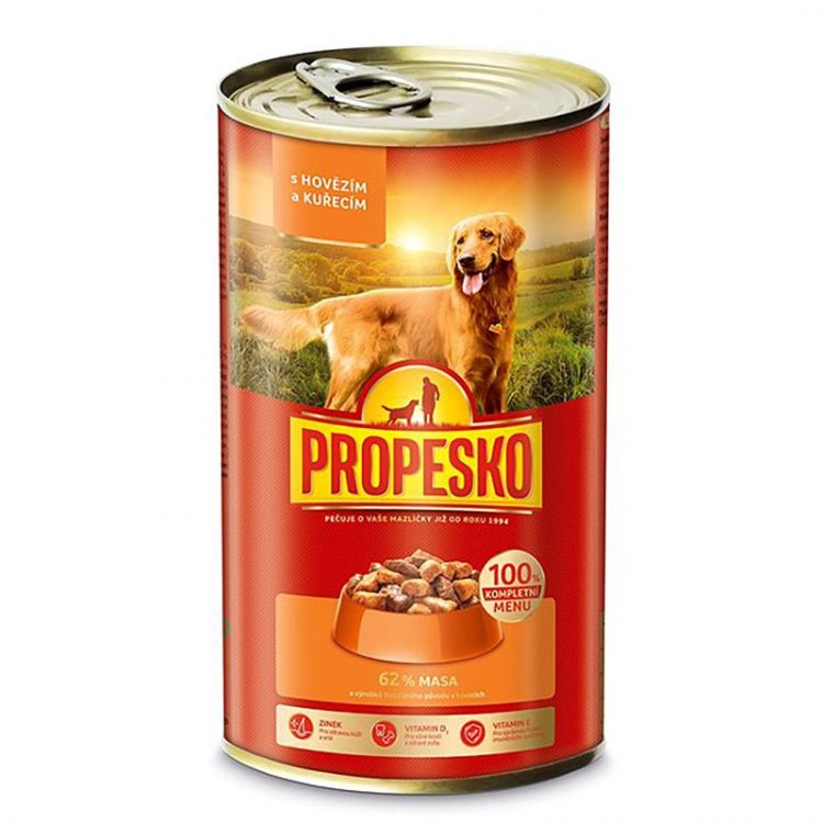 Mäso a výrobky živočíšneho pôvodu (62 % v kúskoch, z toho 8 % teľacie, 8 % kuracie), obilniny, minerálne látky, cukry. Kúsky obvykle tvoria cca. 50% hotového produktu.