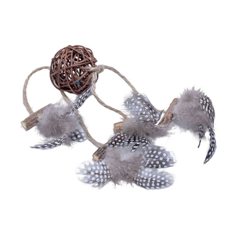 Prútená loptička s otvorenou konštrukciou láka mačky na hravé prehadzovanie a kotúľanie. Viaceré strapce s pierkami stimulujú lovecký inštinkt a podporujú aktívnu hru. Povrázky a drobné drevené prvky dodávajú hračke prirodzený vzhľad a rôznorodé textúry. Ideálna na naháňanie, chytanie a hryzenie. Hračka je vyrobená z prírodných materiálov, bezpečná pre mačky. Doprajte svojej mačke interaktívnu zábavu, ktorá ju povzbudí k pohybu a hre!