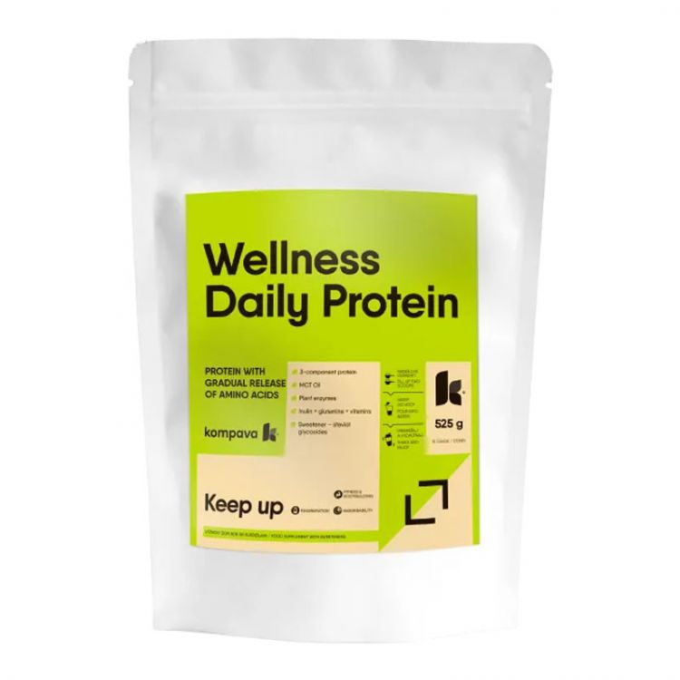 Jedinečný 3-zložkový proteín s obsahom 65% bielkovín. S príchuťou kokos - čokoláda. Od konkurencie sa odlišuje svojim špeciálnym zložením. Má tzv. Long-Term-Fuel účinok, čo znamená, že bielkoviny a tuky, ktoré sa do krvi vylučujú pomaly, napomáhajú dlhodobej regenerácii organizmu. Wellness Daily Protein je navrhnutý tak, aby telu dopĺňal všetky potrebné látky s dôrazom na maximálnu efektívnosť a využiteľnosť v organizme. Pomáha dosiahnuť stanovené ciele vyformovanej postavy a zdravého životného štýlu. Obsahuje 3 druhy bielkovín, MCT tuky, vlákninu, L-glutamín, BCAA 2:1:1, enzýmy a vitamíny C, E, chróm a zinok. Zabezpečuje dostatočný a dlhodobý prísun všetkých potrebných látok pre správne fungovanie zaťaženého organizmu. Vďaka svojmu zloženiu a vitamínom C a E, minerálu zinku podporuje normálnu funkciu imunitného systému. Svojím zložením nemá na trhu konkurenciu a kombináciou látok je úplne jedinečný v úprave a nastavení správneho fungovania organizmu.