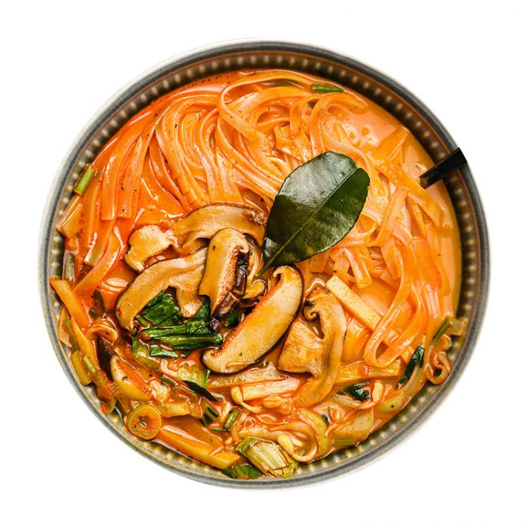 kokosové mlieko (kokosový extrakt 53 %, pitná voda, antioxidant: kyselina citrónová), ryžové rezance (ryžová múka, tapiokový škrob, cukor, jedlá soľ), kari pasta (cesnak, sušené čili, citrónová tráva, šalotka, jedlá soľ, galangal, krevetová pasta (KREVETY, jedlá soľ), kôra kaffirovej limety, čierne korenie), pak choi, zeleninový bujón (jedlá soľ jódovaná, zmes zeleniny 4 % (mrkva, cibuľový prášok, pór), tuky - palmový a shea v rôznych pomeroch, glukóza, zemiakový škrob, petržlenový list, kurkuma, aróma, farbivá amoniak sulfitový, karamel, riboflavín), zvýrazňovač chuti glutamán sodný, inozinán sodný, konzervant sorban draselný), huby shiitake, limetový list, rybacia omáčka (ANČOVIČKY, jedlá soľ, cukor), vyprážaný cesnak, SEZAMOVÝ olej, jarná cibuľka, SÓJOVÉ klíčky, cukor, koriander, SEZAM