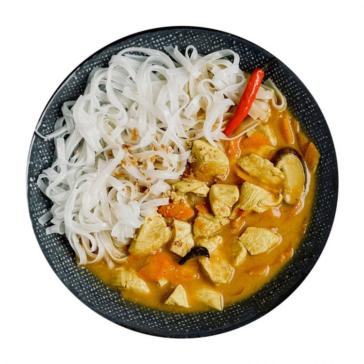 kari omáčka 25% (kuracie prsia 16%, mrkva 13%, pasta 3% (červené čili 20%, citrónová tráva, cesnak, soľ, šalotka, galangal, kurkuma, škorica, muškátový kvet, koriander, rasca), kokosové mlieko (kokosový extrakt 53%, voda, antioxidant kyselina citrónová), huby shiitake, zázvor, cibuľa, rybacia omáčka (extrakt z rýb – ančovičky, soľ, cukor), cesnak, limetové listy, soľ, korenie), ryžové rezance 18,5% (ryžová múka, tapiokový škrob, cukor, jedlá soľ).