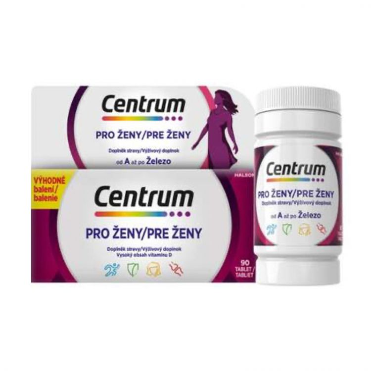 Centrum pre ženy je vysokokvalitný komplexný multivitamín pre ženy, ktorí chcú žiť aktívny a zdravý životný štýl. Ponúka jedinečné zloženie s obsahom 13 vitamínov a 10 minerálov, ktoré pracujú spoločne na podpore vášho zdravia každý deň. Vitamíny A, C, D a E spolu s vápnikom podporujú energiu, zdravie kostí, vlasov a kože. S jedinou tabletou denne pokryjete 100% vašich denných potrieb vitamínov* a vy tak nemusíte siahať po viacerých výživových doplnkoch. Centrum od A po železo neobsahuje lepok, laktózu, cukor a umelé sladidlá.