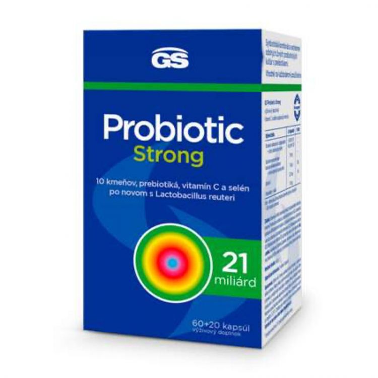 GS Probiotic Strong, výživový doplnok sú komplexné a silné probiotiké kultúry s prebiotikami, na každodenné použitie. Obsahujú unikátny komplex 10 odolných kmeňov, laktobacilov, bifidobaktérií a ďalších užitočných mikroorganizmov. S vitamínom C a selénom na podporu imunity. 21 miliárd mikroorganizmov v dennej dávke.
